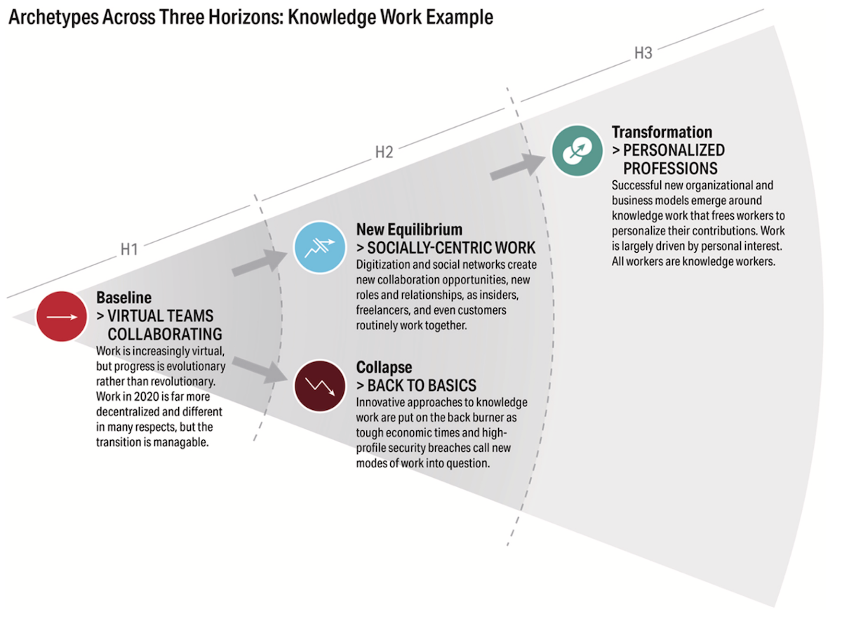 - Horizon three are emergent changes, pockets of the future in the present, initially with low strategic fit, over time become our visions of the future.