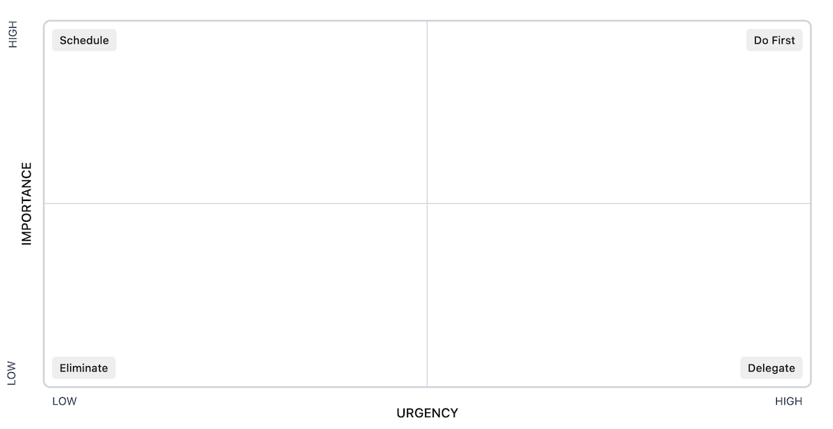 Prioritise tasks by urgency and importance. This classic framework helps you distinguish between tasks that need immediate attention, those to schedule, delegate, or even eliminate, ensuring your efforts align with your most critical goals.