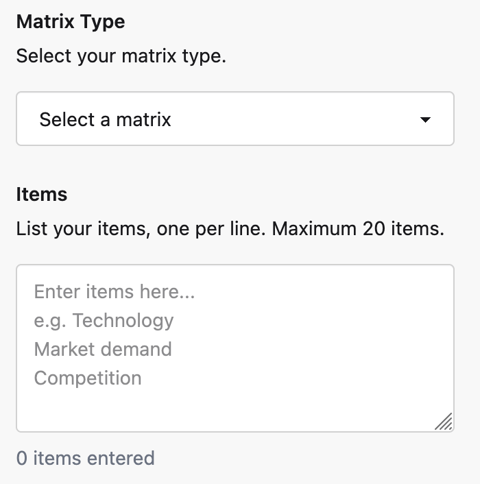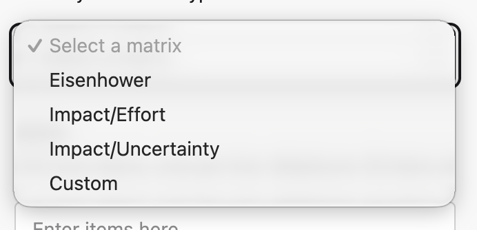 Matrices provide powerful visual frameworks to help you categorise, prioritise, and make informed decisions. There are many variations of these, all of which map your ideas (projects, tasks, risks) onto a 2 x 2 grid using 2 criteria.